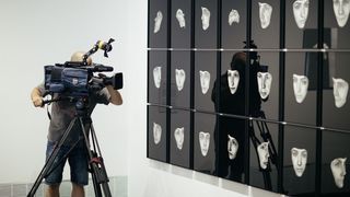 Mladý pár si prohlíží Skleněnou krávu v sále Jídlo a pití. Na stěně za nimi visí šest velkých černobílých portrétů na téma chuť.